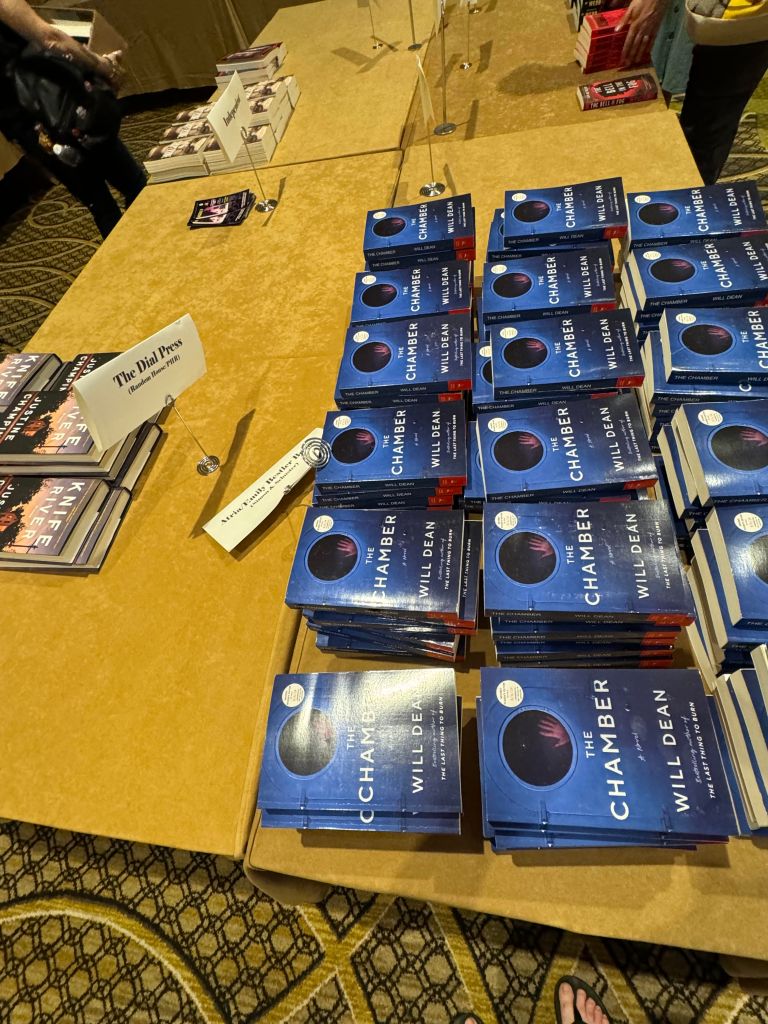 Other first-time attendees might not know, but registering for Bouchercon also gets you four tickets for the Book Bazaar—a room completely stocked with books that attendees can take, for free! New releases and old favorites are separated by publisher, and you get to exchange your tickets for books to take home with you. It’s a great value, if you like hardcovers, and an opportunity to grab books by attending authors and get them signed. We got ours early and are glad we did; some titles will sell out by the end of the first day.